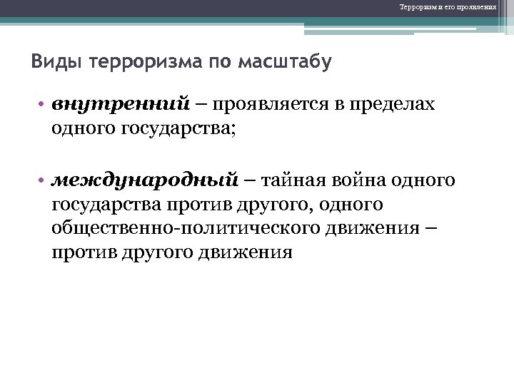 Терроризм и его проявления Виды терроризма по масштабу • внутренний – проявляется в пределах одного государства; • международный – тайная война одного государства против другого, одного общественно политического движения – против другого движения