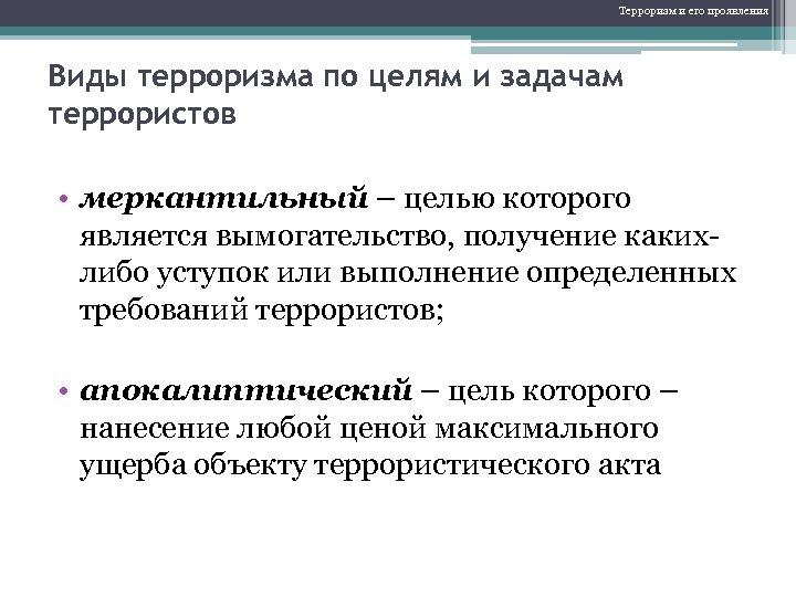 Терроризм и его проявления Виды терроризма по целям и задачам террористов • меркантильный – целью которого является вымогательство, получение каких либо уступок или выполнение определенных требований террористов; • апокалиптический – цель которого – нанесение любой ценой максимального ущерба объекту террористического акта