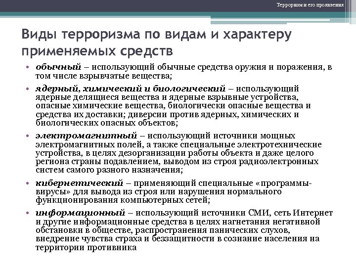 Терроризм и его проявления Виды терроризма по видам и характеру применяемых средств • обычный – использующий обычные средства оружия и поражения, в том числе взрывчатые вещества; • ядерный, химический и биологический – использующий ядерные делящиеся вещества и ядерные взрывные устройства, опасные химические вещества, биологически опасные вещества и средства их доставки; диверсии против ядерных, химических и биологических опасных объектов; • электромагнитный – использующий источники мощных электромагнитных полей, а также специальные электротехнические устройства, в целях дезорганизации работы объекта и даже целого региона страны подавлением, выводом из строя радиоэлектронных систем самого разного назначения; • кибернетический – применяющий специальные «программы вирусы» для вывода из строя или нарушения нормального функционирования компьютерных сетей; • информационный – использующий источники СМИ, сеть Интернет и другие информационные средства в целях нагнетания негативной обстановки в обществе, распространения панических слухов, внедрение чувства страха и беззащитности в сознание населения на территории противника