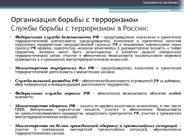 Терроризм и его проявления Организация борьбы с терроризмом Службы борьбы с терроризмом в России: • Федеральная служба безопасности РФ – предупреждение, выявление и пресечение террористической деятельности; предупреждение, выявление и пресечение попыток нарушения террористами государственной границы РФ и незаконное перемещение через границу РФ оружия, взрывчатых, опасных химических и радиоактивных веществ, а также предметов, которые могут быть использованы в качестве средств совершения террористических актов; участие в обеспечении безопасности национального морского судоходства и в проведении контртеррористических операций; • Министерство внутренних дел РФ – предупреждение, выявление и пресечение террористической деятельности с корыстными целями; • Служба внешней разведки РФ – обеспечение безопасности учреждений РФ за рубежом, сбор информации о международной деятельности террористов; • Федеральная служба охраны РФ – обеспечение безопасности объектов особой важности; • Министерство обороны РФ – защита от оружия различного назначения, в том числе ОМП, боеприпасов, взрывчатых веществ, участие в обеспечении безопасности на ционального орского судоходства, воздушного пространства РФ, участие в проведении м контртеррористических операций; • Министерство по делам гражданской обороны и чрезвычайных ситуаций – участие в ликвидации последствий чрезвычайных ситуаций, обусловленных террористическими актами