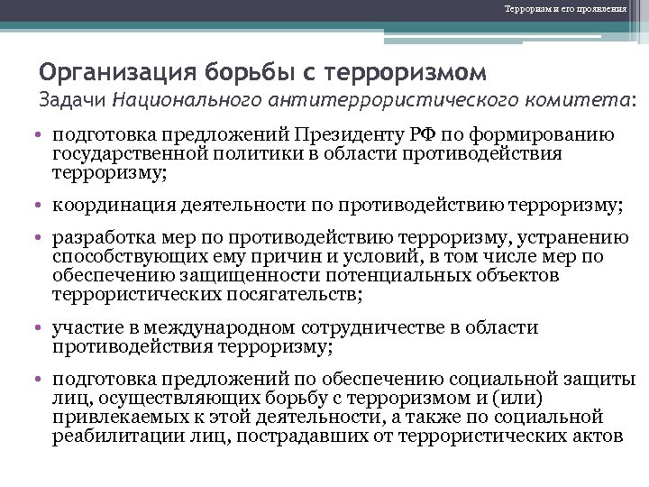 Терроризм и его проявления Организация борьбы с терроризмом Задачи Национального антитеррористического комитета: • подготовка предложений Президенту РФ по формированию государственной политики в области противодействия терроризму; • координация деятельности по противодействию терроризму; • разработка мер по противодействию терроризму, устранению способствующих ему причин и условий, в том числе мер по обеспечению защищенности потенциальных объектов террористических посягательств; • участие в международном сотрудничестве в области противодействия терроризму; • подготовка предложений по обеспечению социальной защиты лиц, осуществляющих борьбу с терроризмом и (или) привлекаемых к этой деятельности, а также по социальной реабилитации лиц, пострадавших от террористических актов