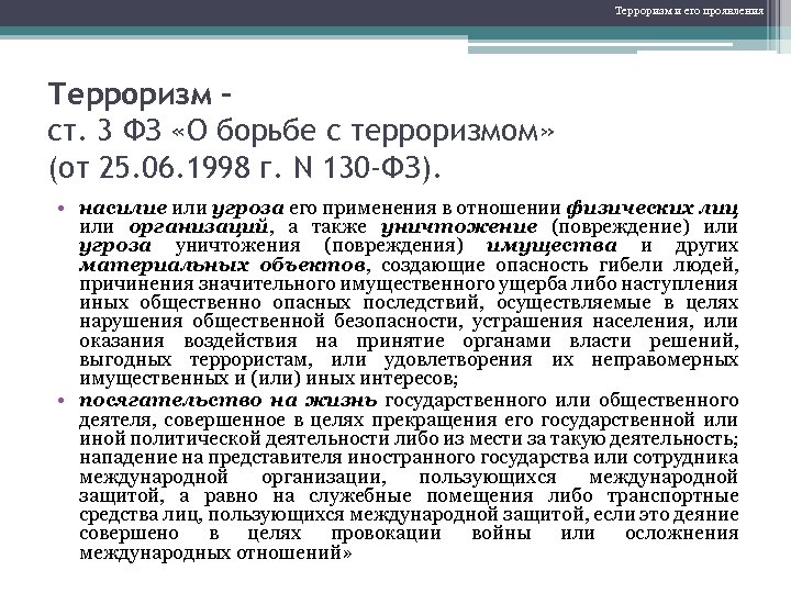 Терроризм и его проявления Терроризм – ст. 3 ФЗ «О борьбе с терроризмом» (от 25. 06. 1998 г. N 130 -ФЗ). • насилие или угроза его применения в отношении физических лиц или организаций, а также уничтожение (повреждение) или угроза уничтожения (повреждения) имущества и других материальных объектов, создающие опасность гибели людей, причинения значительного имущественного ущерба либо наступления иных общественно опасных последствий, осуществляемые в целях нарушения общественной безопасности, устрашения населения, или оказания воздействия на принятие органами власти решений, выгодных террористам, или удовлетворения их неправомерных имущественных и (или) иных интересов; • посягательство на жизнь государственного или общественного деятеля, совершенное в целях прекращения его государственной или иной политической деятельности либо из мести за такую деятельность; нападение на представителя иностранного государства или сотрудника международной организации, пользующихся международной защитой, а равно на служебные помещения либо транспортные средства лиц, пользующихся международной защитой, если это деяние совершено в целях провокации войны или осложнения международных отношений»