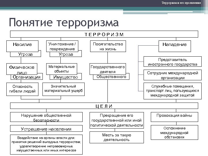 Терроризм и его проявления Понятие терроризма ТЕРРОРИЗМ Насилие Угроза Физическое лицо Организация Опасность гибели людей Уничтожение / повреждение Посягательство на жизнь Нападение Угроза Материальные объекты Имущество Государственного деятеля Общественного Значительный материальный ущерб Представитель иностранного государства Сотрудник международной организации Служебные помещения, транспорт лиц, пользующихся международной защитой ЦЕЛИ Нарушение общественной безопасности Устрашение населения Воздействие на органы власти для: принятия решений выгодных террористам; удовлетворение неправомерных имущественных или иных интересов Прекращение его государственной или иной политической деятельности Месть за такую деятельность Провокация войны Осложнение международной обстановки