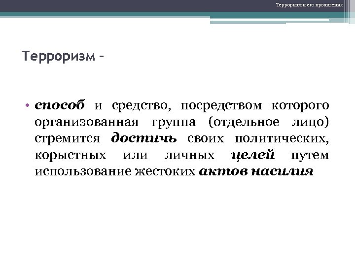 Терроризм и его проявления Терроризм - • способ и средство, посредством которого организованная группа (отдельное лицо) стремится достичь своих политических, корыстных или личных целей путем использование жестоких актов насилия