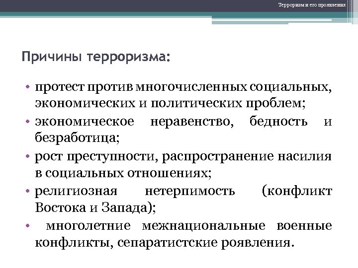 Терроризм и его проявления Причины терроризма: • протест против многочисленных социальных, экономических и политических проблем; • экономическое неравенство, бедность и безработица; • рост преступности, распространение насилия в социальных отношениях; • религиозная нетерпимость (конфликт Востока и Запада); • многолетние межнациональные военные конфликты, сепаратистские роявления.