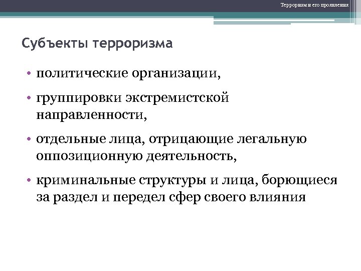 Терроризм и его проявления Субъекты терроризма • политические организации, • группировки экстремистской направленности, • отдельные лица, отрицающие легальную оппозиционную деятельность, • криминальные структуры и лица, борющиеся за раздел и передел сфер своего влияния
