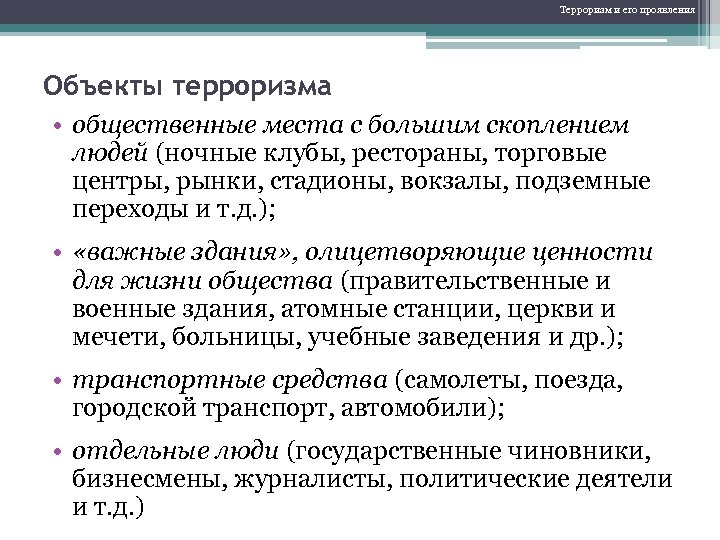 Терроризм и его проявления Объекты терроризма • общественные места с большим скоплением людей (ночные клубы, рестораны, торговые центры, рынки, стадионы, вокзалы, подземные переходы и т. д. ); • «важные здания» , олицетворяющие ценности для жизни общества (правительственные и военные здания, атомные станции, церкви и мечети, больницы, учебные заведения и др. ); • транспортные средства (самолеты, поезда, городской транспорт, автомобили); • отдельные люди (государственные чиновники, бизнесмены, журналисты, политические деятели и т. д. )