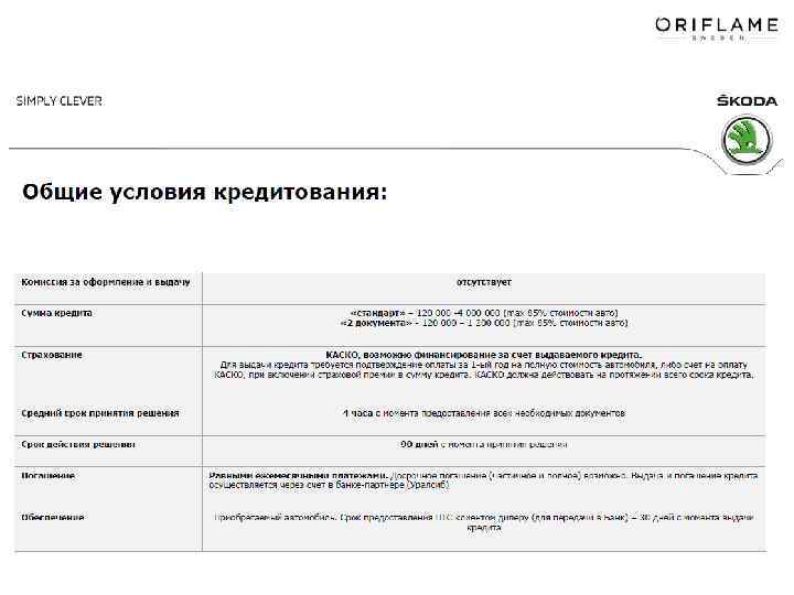Volkswagen bank – самое выгодное предложение с самой низкой кредитной ставкой для Орифлэйм – 15%. Представители Volkswagen bank присутствуют в каждом Дилерском центре Skoda Адреса всех Дилерских центров Skoda в России – здесь: http: //www. skoda-avto. ru/dealers