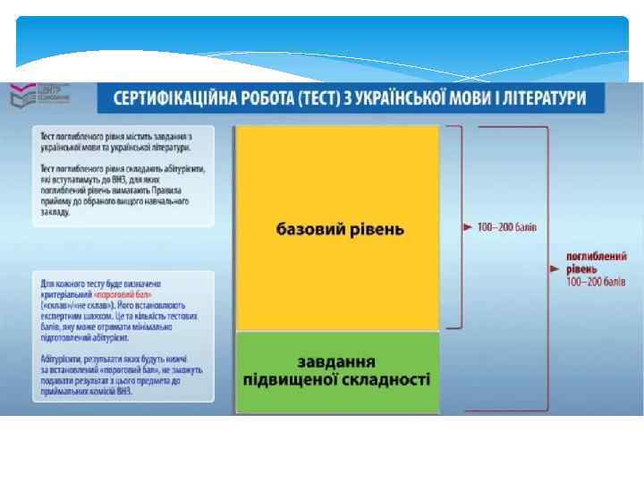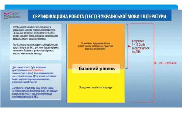 СЕРТИФІКАЦІЙНА РОБОТА ЗНО БАЗОВОГО РІВНЯ З УКРАЇНСЬКОЇ МОВИ І ЛІТЕРАТУРИ Сертифікаційна робота базового рівня з української мови і літератури містить 58 завдань, на виконання яких буде відведено 150 хвилин. Тест ЗНО з української мови і літератури базового рівня складається із завдань трьох форм: завдань з вибором однієї правильної відповіді, завдань на встановлення відповідності та завдання з розгорнутою відповіддю.
