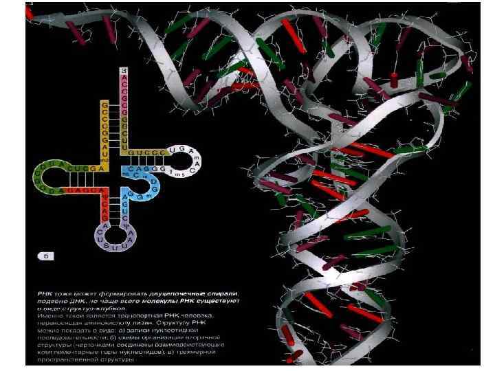 Однотяжевой полимер РНК сворачивается на себя и скручивается в компактную структуру, подобно сворачиванию полипептидной цепи белка в компактную глобулу. Таким способом уникальные нуклеотидные последовательности РНК могут формировать уникальные пространственные структуры. Атомная (слева) и скелетная (справа) модели фенилаланиновой т. РНК дрожжей