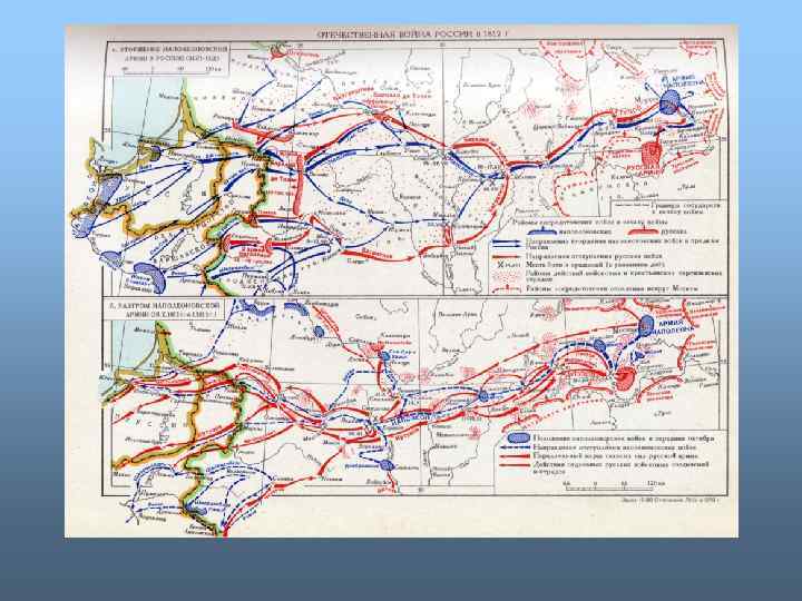 • • • 23 июня 1812 года (по старому стилю) между 8 и 9 часами вечера армия Наполеона переправилась через Неман. Началась Отечественная война 1812 года. 4 -6 августа произошло Смоленское сражение, закончившееся поражением Наполеона. 26 августа произошло решающее сражение у деревни Бородино. 1 сентября на военном совете в Филях принято решение оставить Москву без боя, чтобы сохранить армию. 2 сентября Наполеон вошел в Москву. Тогда же в Москве начался пожар. 7 октября Наполеон покинул Москву. 23 декабря царский манифест об окончании Отечественной войны.