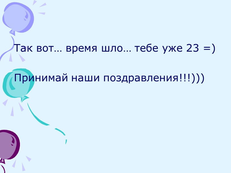 Так вот… время шло… тебе уже 23 =) Принимай наши поздравления!!!)))
