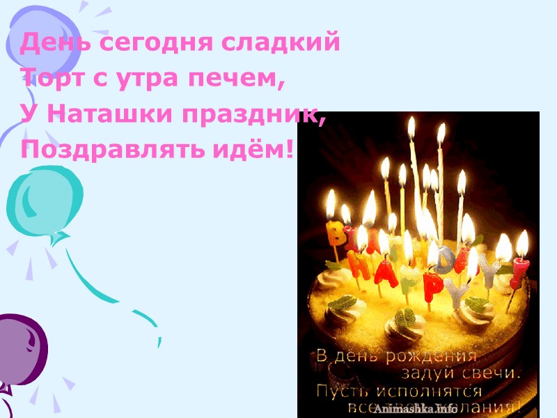 День сегодня сладкий Торт с утра печем, У Наташки праздник, Поздравлять идём!
