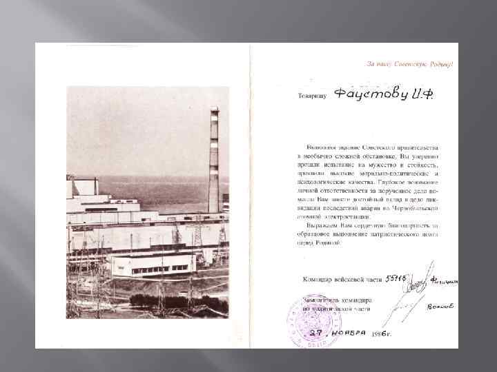 Пожарные, потушившие пожар на 4 -м блоке и погибшие от лучевой болезни КИБЕНОК Виктор Николаевич 17. 02. 1963 -11. 05. 1986 Осталась жена ПРАВИК Владимир Павлович 13. 06. 1962 - 11. 05. 1986 Остались жена и дочь ТИШУРА Владимир Иванович 15. 12. 1959 - 10. 05. 1986 Остались жена и сын ИГНАТЕНКО Василь Иванович 13. 03. 1961 - 13. 05. 1986 Осталась жена