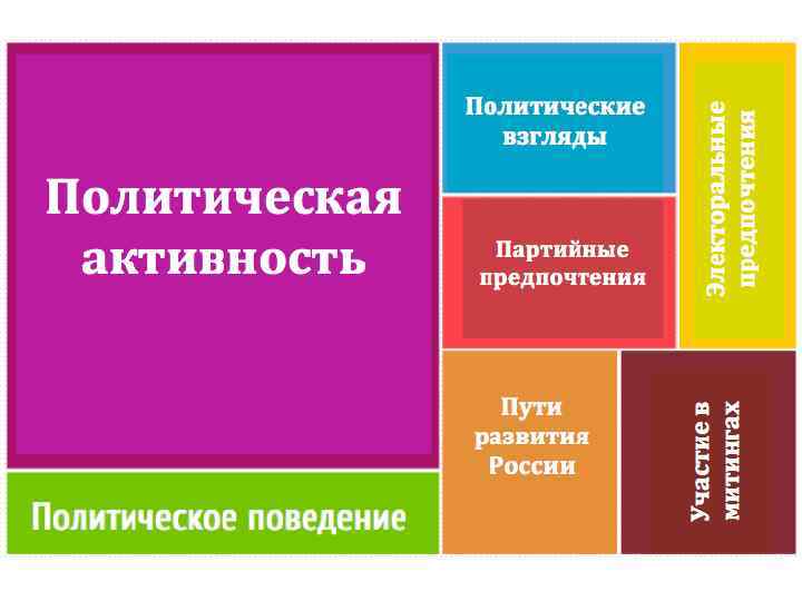 Партийные предпочтения (%) Ничего из вышеперечисленного 31. 9 Патриоты России 0. 2 ПАРНАС 1. 5 Другое 2. 4 Правое дело 2. 9 Справедливая Россия 3. 1 Националистическая партия 3. 3 Яблоко Не интересуются политикой Интересуются политикой 7. 1 КПРФ 9. 1 ЛДПР 11. 7 Единая Россия 13. 7 0 10 20 30 40