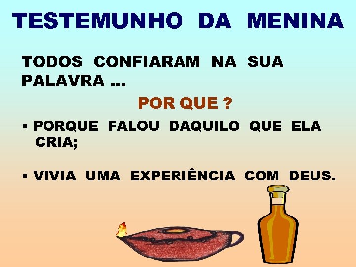 TESTEMUNHO DA MENINA TODOS CONFIARAM NA SUA PALAVRA. . . POR QUE ? • PORQUE FALOU DAQUILO QUE ELA CRIA; • VIVIA UMA EXPERIÊNCIA COM DEUS.