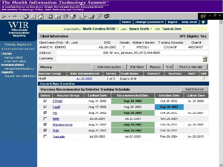 Background and Timeline • 1998 – Work group formed to develop project demonstrating the secure use of the Internet to access clinical information. Children's immunization records were selected and NCHICA members volunteer to contribute to prototype development. • 1999 – Initial demonstration sites online • 2000 – Trial use of PKI technology not successful • 2002 – NC reviews fully-functional registry technology • 2004 - NC DPH awards contract for modification and implementation of WI system in NC beginning in late 2004
