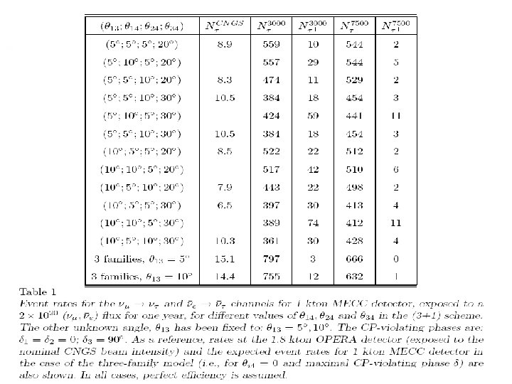 Experimental details: Detector Efficiencies • Hybrid. MIND=4 kton MECC+50 kton MIND Placed in front of MIND • MIND (ISS detector report) above 10 Ge. V Increasing linearly from at 1 Ge. V above 1 Ge. V (the MINOS one) • MECC (Magnetized Emulsion Cloud Chamber) above 5 Ge. V Ar. Xiv: hep-ph/03051805 x 5, thanks to magnetization decays into e and into hadrons can be used in addition to decay (only the 17% of the total)