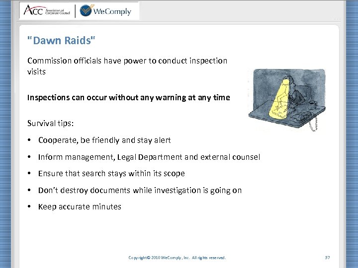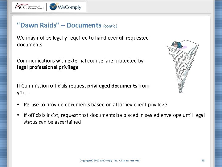 "Dawn Raids" Commission officials have power to conduct inspection visits Inspections can occur without any warning at any time Survival tips: • Cooperate, be friendly and stay alert • Inform management, Legal Department and external counsel • Ensure that search stays within its scope • Don’t destroy documents while investigation is going on • Keep accurate minutes Copyright© 2010 We. Comply, Inc. All rights reserved. 57
