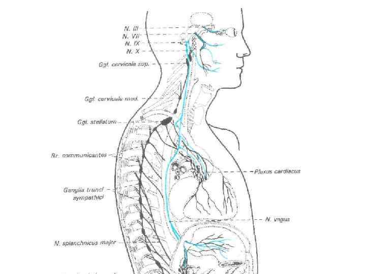 2 3 1 Головной отдел r. m r. n. X ct Fiss. t-m Can. mast. r. auric f. iu Gn. s Gn. i Шейный отдел rr. phar n. lar. sup n. lar. recc Apertura thoracis sup a. Ao Грудной отдел rr. tracheales rr. bronchiales rr. oesophagiales rr. mediastinales rr. card. med rr. card. sup rr. pericardiaci rr. card. inf Hiatus es. d Брюшной отдел rr. renales rr. intestinales N. Vagus dexter (sin) Truncus vagalis ant (post) rr. gastrici rr. lienales Rami colici (иннервируют толстую кишку до середины нисходящей ободочной)