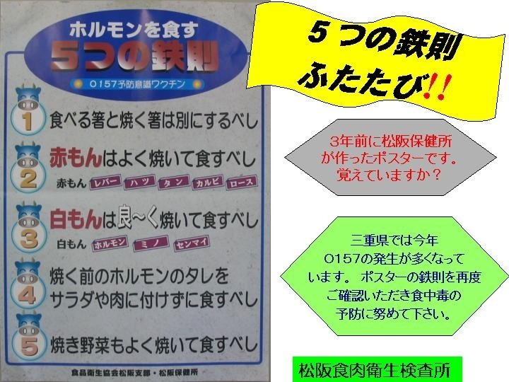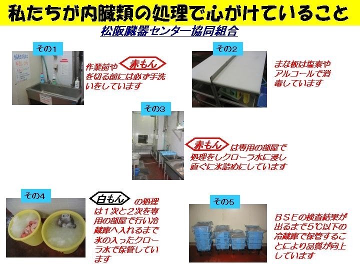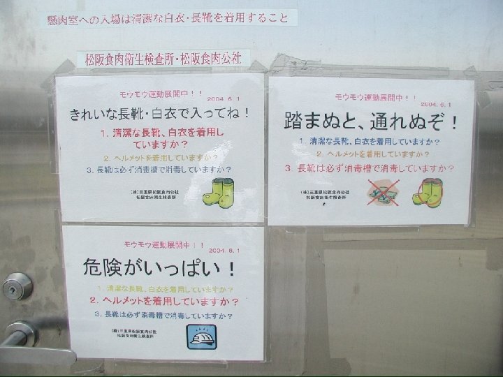 :平成 14年 6月~ 10月 モウモウ運動 (ア)掲示板・講習会・ホームページを利用した衛生知識の普及とコミ ュニケーションの強化 (イ)デジカメ画像を提示することによる剥皮・解体行程の見直し (ウ)搬送車の衛生管理の徹底 (エ)保健所と連携した衛生知識普及活動 (オ)衛生対策会議の開催 (カ)見学者の受け入れ 平成 16年度 ・ モーモー掲示板による衛生知識の普及とコミュニケーション ・ チラシによる個人周知 ・ 白衣・長靴に加え、ヘルメットの貸し出し ・ 業種別衛生講習会: 食肉処理従業員、松阪食肉公社職員、内 臓取扱い業者及び従業員対象