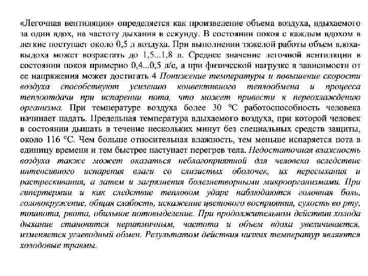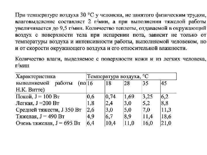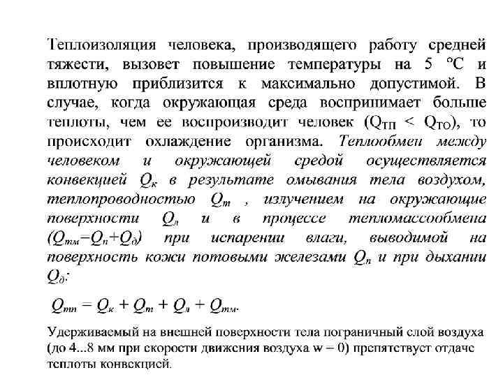 Теплообмен человека с окружающей средой. • Одним из показателей теплового состояния организма является средняя температура тела (внутренних органов). Наивысшая температура внутренних органов составляет +43 °С, минимальная +25 °С. Температурный режим кожи играет основную роль в теплоотдаче. Ее температура меняется в довольно значительных пределах и при нормальных условиях средняя температура кожи под одеждой составляет 30. . . 34 °С. При неблагоприятных метеорологических условиях на отдельных участках тела она может понижаться до 20 °С, а иногда и ниже. Нормальное тепловое самочувствие имеет место, когда тепловыделение Qтп человека полностью воспринимается окружающей средой Qтo, т. е. когда имеет место тепловой баланс Qтп = Qтo.