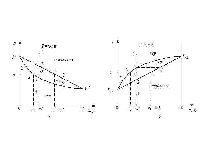 Законы Вревского (1911 г. ): 1 -й закон: При повышении температуры раствора в равновесном паре повышается относительное содержание того компонента, парциальная молярная энтальпия испарения которого больше. 2 -закон: В азеотропной смеси с минимумом на изобаре (максимумом на изотерме, рис. а) при повышении давления (температуры) возрастает концентрация компонента с большей парциальной молярной теплотой испарения. В азеотропной смеси с максимумом на изобаре (минимумом на изотерме, рис. б) при повышении давления (температуры) возрастает концентрация компонента с меньшей парциальной молярной теплотой испарения