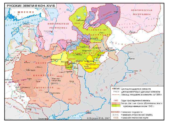 Рост территории Московского княжества При ком? Когда? Что? Даниил 1300 Александрович 1302 Коломна Юрий Даниилович 1303 Можайск Иван Калита 1328 Галич, Углич, Белоозеро Переяславское княжество