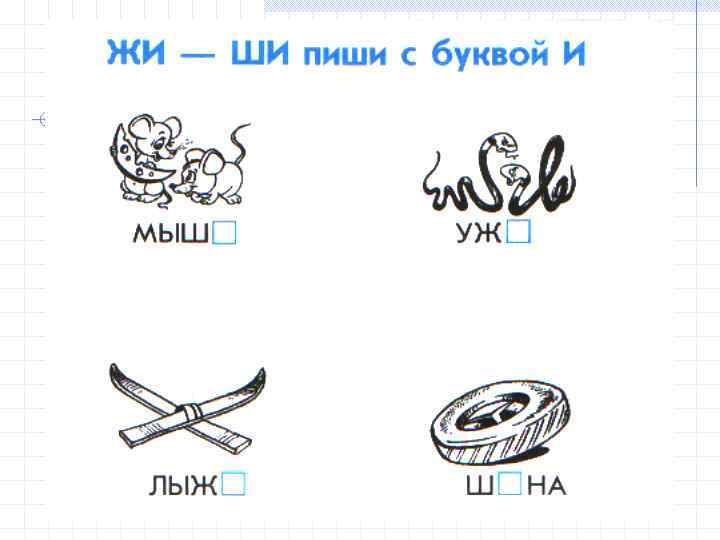 Вставь буквы: Ж и лет, ж и вотное , ж и вот, . . . Ж и рафы, ж и вопись, ж и вёт, . . . Ш и повник, ш и ны, камыш и , . . . Маш и ны и карандаш и. . . Круж и ть, служ и ть, друж и ть и ж и ть, . . Спеш и ть, смеш. ть, ш и петь и ш и. . . ть. и Все сочетанья ЖИ и ШИ только с буквой И пиши.