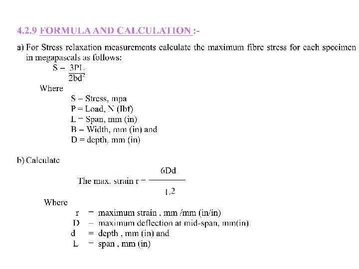 3) Max. fiber stress- test method ‘ 1’ S = 3 PL / 2 bd 2 Where, S = stress in the outer fiber at midspan (Mpa) p = load at given point on the load deflection curve(v) L= support beam (mm) b= width of beam tested (mm) d = depth of beam tested in (mm) 4) Maximum fiber stress for beam tested at large support spans-test method ‘ 1’, S = (3 PL / 2 bd 2 ) 1+ 6(D/L)2 – 4(d/l) (D/L) 5) Max. fiber stress-test method ‘ 2’ S = PL / bd 2 For a load span of ½ of the support span S = 3 PL / 4 bd 2
