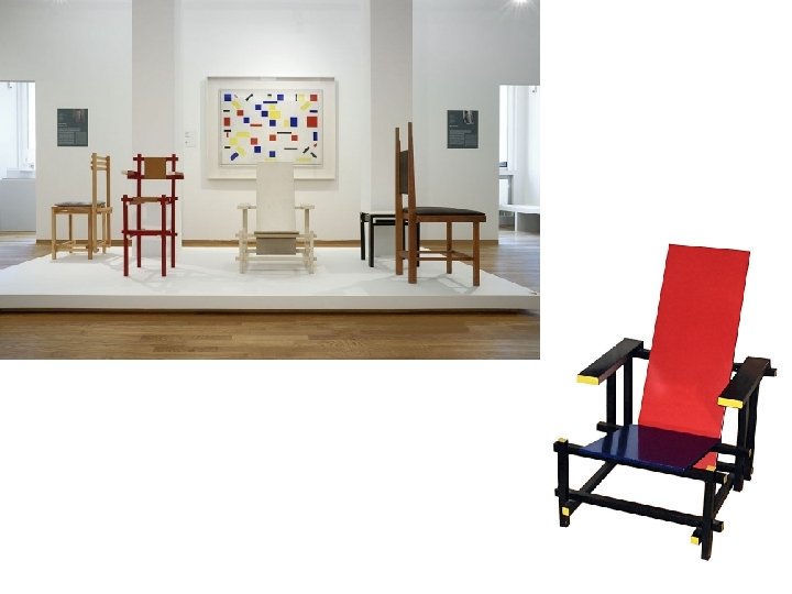 De Stijl (1917) • Piet Mondriaan, van Doesburg, Van der Leck, Rietveld e. a. • Mondriaan belangrijke theoreticus van de groep • Zijn werk in primaire kleuren en horizontale en verticale lijnen gaf hij de naam neoplasticisme.