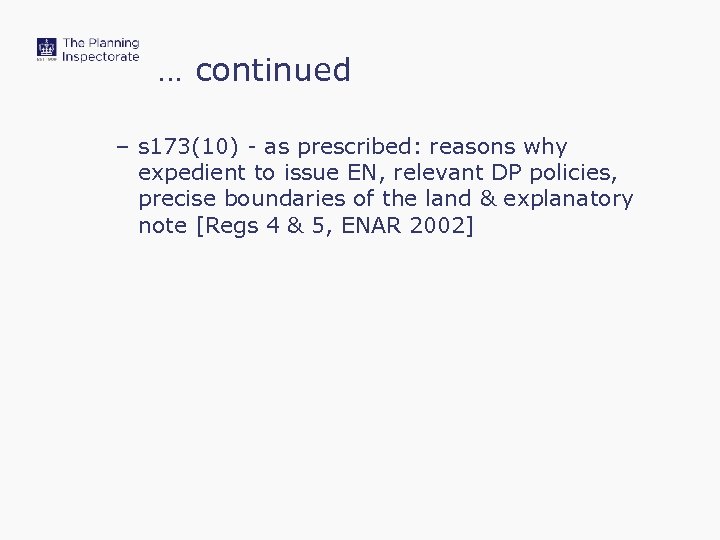 … continued – s 173(10) - as prescribed: reasons why expedient to issue EN, relevant DP policies, precise boundaries of the land & explanatory note [Regs 4 & 5, ENAR 2002]