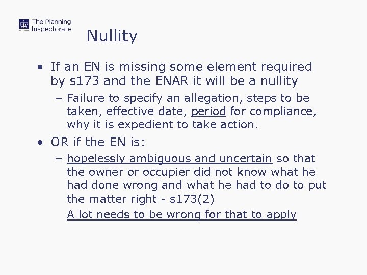 Nullity • If an EN is missing some element required by s 173 and the ENAR it will be a nullity – Failure to specify an allegation, steps to be taken, effective date, period for compliance, why it is expedient to take action. • OR if the EN is: – hopelessly ambiguous and uncertain so that the owner or occupier did not know what he had done wrong and what he had to do to put the matter right - s 173(2) A lot needs to be wrong for that to apply