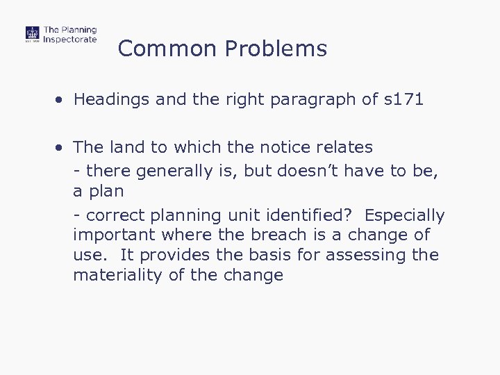 Common Problems • Headings and the right paragraph of s 171 • The land to which the notice relates - there generally is, but doesn’t have to be, a plan - correct planning unit identified? Especially important where the breach is a change of use. It provides the basis for assessing the materiality of the change