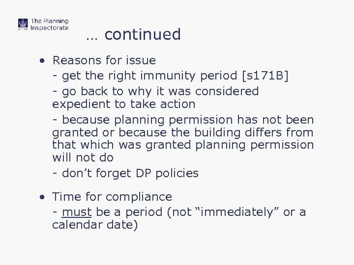 … continued • Reasons for issue - get the right immunity period [s 171 B] - go back to why it was considered expedient to take action - because planning permission has not been granted or because the building differs from that which was granted planning permission will not do - don’t forget DP policies • Time for compliance - must be a period (not “immediately” or a calendar date)