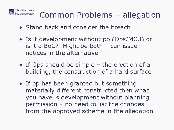 Common Problems – allegation • Stand back and consider the breach • Is it development without pp (Ops/MCU) or is it a Bo. C? Might be both – can issue notices in the alternative • If Ops should be simple – the erection of a building, the construction of a hard surface • If pp has been granted but something materially different constructed then what you have is development without planning permission – no need to list the changes from the approved scheme in the allegation