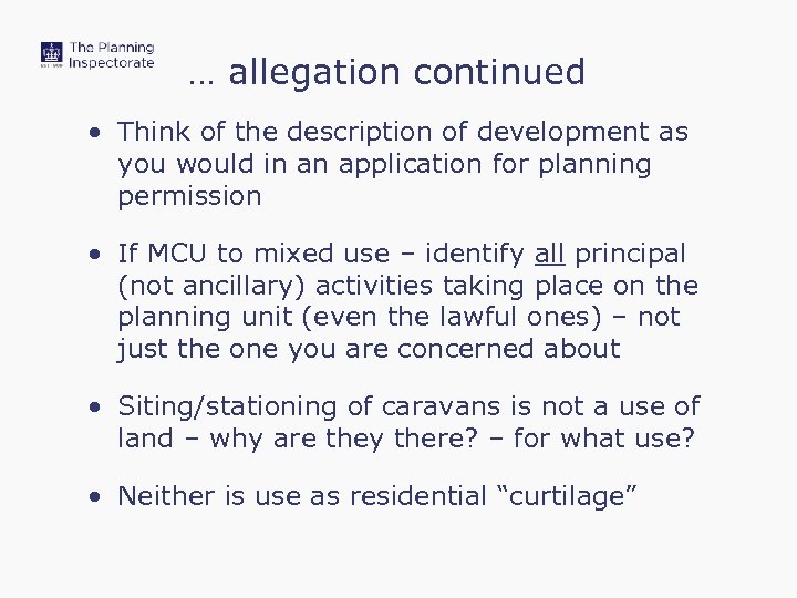 … allegation continued • Think of the description of development as you would in an application for planning permission • If MCU to mixed use – identify all principal (not ancillary) activities taking place on the planning unit (even the lawful ones) – not just the one you are concerned about • Siting/stationing of caravans is not a use of land – why are they there? – for what use? • Neither is use as residential “curtilage”