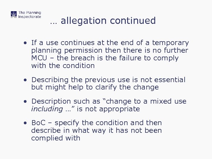 … allegation continued • If a use continues at the end of a temporary planning permission there is no further MCU – the breach is the failure to comply with the condition • Describing the previous use is not essential but might help to clarify the change • Description such as “change to a mixed use including …” is not appropriate • Bo. C – specify the condition and then describe in what way it has not been complied with