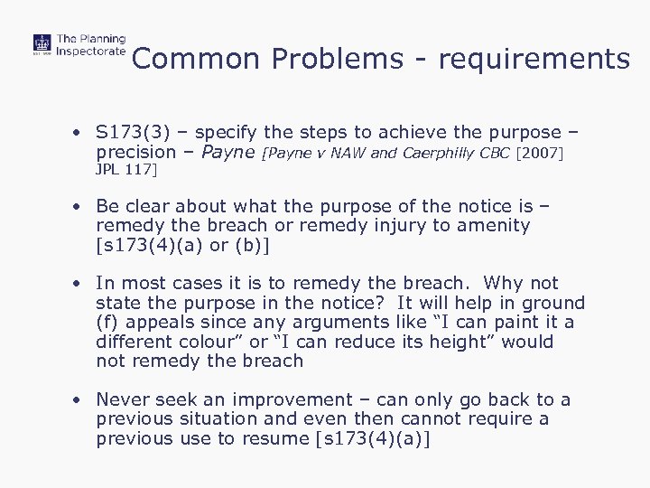 Common Problems - requirements • S 173(3) – specify the steps to achieve the purpose – precision – Payne [Payne v NAW and Caerphilly CBC [2007] JPL 117] • Be clear about what the purpose of the notice is – remedy the breach or remedy injury to amenity [s 173(4)(a) or (b)] • In most cases it is to remedy the breach. Why not state the purpose in the notice? It will help in ground (f) appeals since any arguments like “I can paint it a different colour” or “I can reduce its height” would not remedy the breach • Never seek an improvement – can only go back to a previous situation and even then cannot require a previous use to resume [s 173(4)(a)]