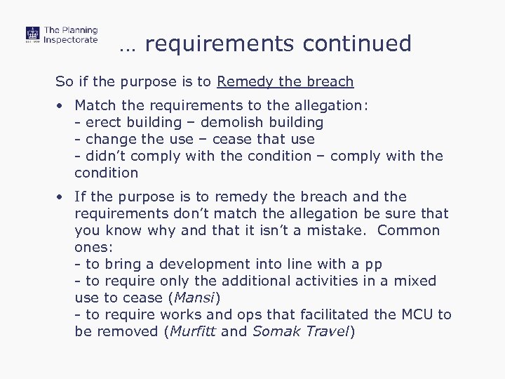 … requirements continued So if the purpose is to Remedy the breach • Match the requirements to the allegation: - erect building – demolish building - change the use – cease that use - didn’t comply with the condition – comply with the condition • If the purpose is to remedy the breach and the requirements don’t match the allegation be sure that you know why and that it isn’t a mistake. Common ones: - to bring a development into line with a pp - to require only the additional activities in a mixed use to cease (Mansi) - to require works and ops that facilitated the MCU to be removed (Murfitt and Somak Travel)