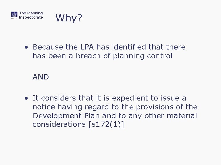 Why? • Because the LPA has identified that there has been a breach of planning control AND • It considers that it is expedient to issue a notice having regard to the provisions of the Development Plan and to any other material considerations [s 172(1)]
