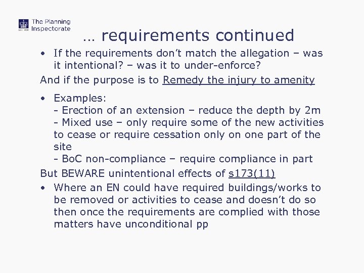 … requirements continued • If the requirements don’t match the allegation – was it intentional? – was it to under-enforce? And if the purpose is to Remedy the injury to amenity • Examples: - Erection of an extension – reduce the depth by 2 m - Mixed use – only require some of the new activities to cease or require cessation only on one part of the site - Bo. C non-compliance – require compliance in part But BEWARE unintentional effects of s 173(11) • Where an EN could have required buildings/works to be removed or activities to cease and doesn’t do so then once the requirements are complied with those matters have unconditional pp