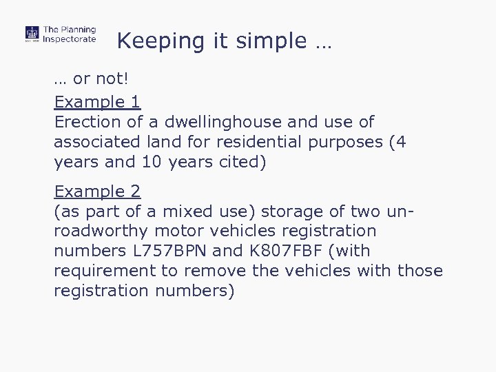 Keeping it simple … … or not! Example 1 Erection of a dwellinghouse and use of associated land for residential purposes (4 years and 10 years cited) Example 2 (as part of a mixed use) storage of two unroadworthy motor vehicles registration numbers L 757 BPN and K 807 FBF (with requirement to remove the vehicles with those registration numbers)
