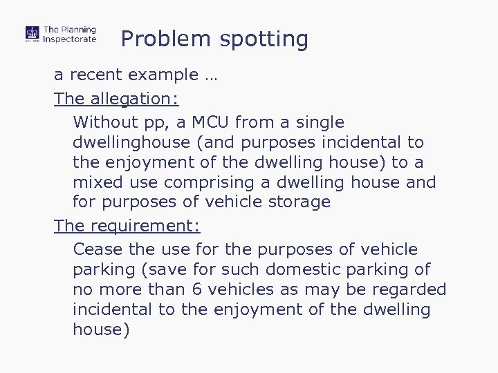 Problem spotting a recent example … The allegation: Without pp, a MCU from a single dwellinghouse (and purposes incidental to the enjoyment of the dwelling house) to a mixed use comprising a dwelling house and for purposes of vehicle storage The requirement: Cease the use for the purposes of vehicle parking (save for such domestic parking of no more than 6 vehicles as may be regarded incidental to the enjoyment of the dwelling house)