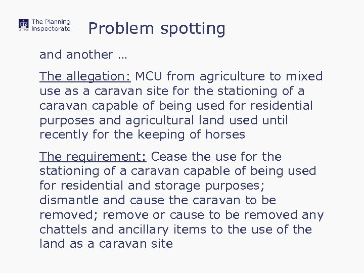 Problem spotting and another … The allegation: MCU from agriculture to mixed use as a caravan site for the stationing of a caravan capable of being used for residential purposes and agricultural land used until recently for the keeping of horses The requirement: Cease the use for the stationing of a caravan capable of being used for residential and storage purposes; dismantle and cause the caravan to be removed; remove or cause to be removed any chattels and ancillary items to the use of the land as a caravan site