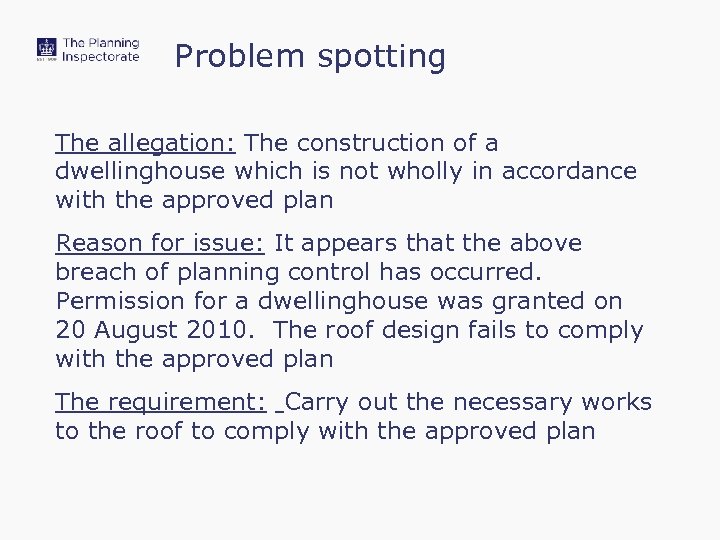Problem spotting The allegation: The construction of a dwellinghouse which is not wholly in accordance with the approved plan Reason for issue: It appears that the above breach of planning control has occurred. Permission for a dwellinghouse was granted on 20 August 2010. The roof design fails to comply with the approved plan The requirement: Carry out the necessary works to the roof to comply with the approved plan