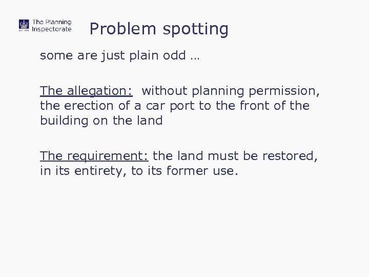 Problem spotting some are just plain odd … The allegation: without planning permission, the erection of a car port to the front of the building on the land The requirement: the land must be restored, in its entirety, to its former use.