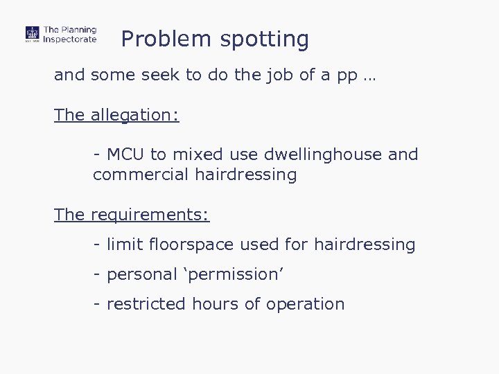 Problem spotting and some seek to do the job of a pp … The allegation: - MCU to mixed use dwellinghouse and commercial hairdressing The requirements: - limit floorspace used for hairdressing - personal ‘permission’ - restricted hours of operation