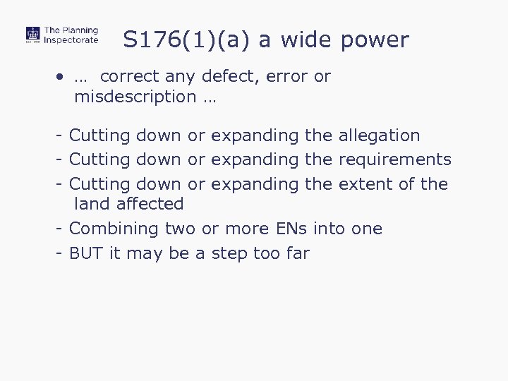 S 176(1)(a) a wide power • … correct any defect, error or misdescription … - Cutting down or expanding the allegation - Cutting down or expanding the requirements - Cutting down or expanding the extent of the land affected - Combining two or more ENs into one - BUT it may be a step too far