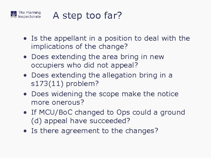 A step too far? • Is the appellant in a position to deal with the implications of the change? • Does extending the area bring in new occupiers who did not appeal? • Does extending the allegation bring in a s 173(11) problem? • Does widening the scope make the notice more onerous? • If MCU/Bo. C changed to Ops could a ground (d) appeal have succeeded? • Is there agreement to the changes?